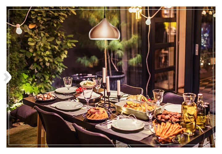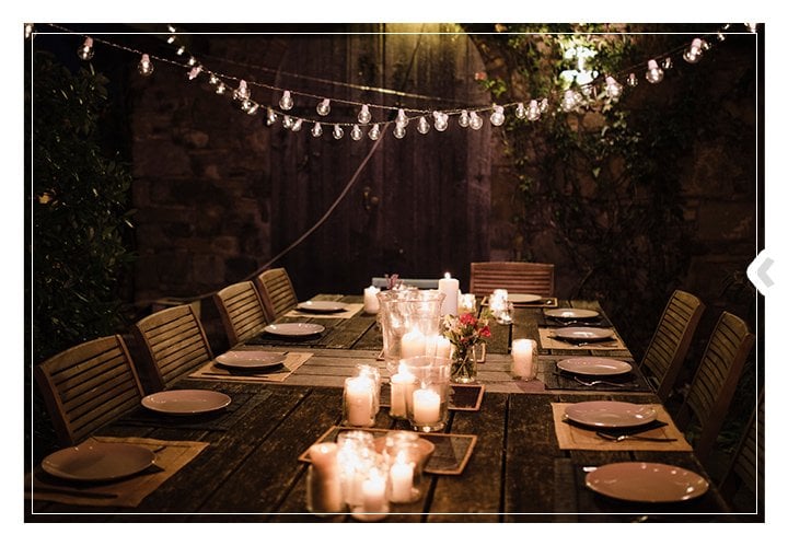 Instead of choosing a show-stopping light display, create a softer, effortless glow to add to a cosy and intimate atmosphere. Perfect for late evening picnics and drinks, layer lighting through LED candles and lamps in an array of styles and sizes. By dotting layered lights around your outdoor space, you can control where your guest’s eyes travel, so if you have a particular decoration or area you want to showcase, you can easily and subtly light these displays up with simple layered lighting.