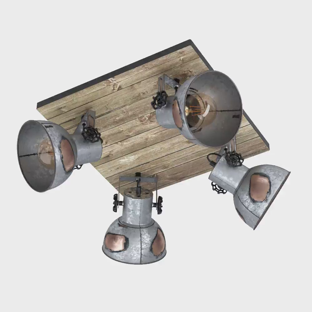The BARNSTAPLE ceiling light features a square metal body with a brown wood grain finish surrounded by a black metal band. The four adjustable spotlights have a distressed steel finish and industrial black detailing to enhance the rustic look. The ceiling spotlight blends seamlessly with trendy interiors, while the pivoting lamp heads allow you to adjust the light to accentuate individual areas of any room