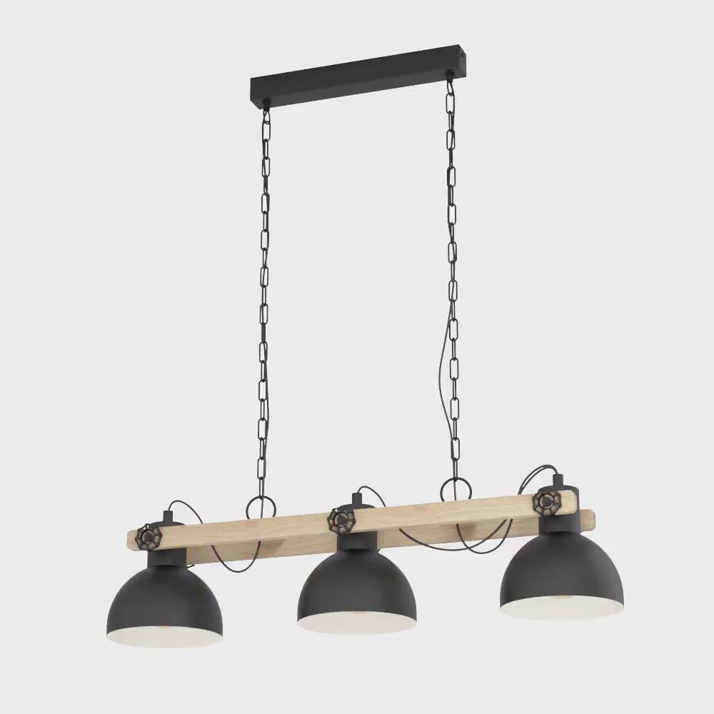 Eglo Lubenham Three Lamp Linear Pendant in Black with Wood Detailing