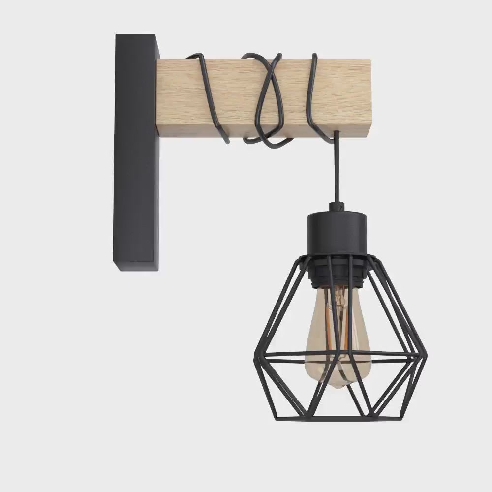The TOWNSHEND 5 wall light is made of black metal and has a wooden arm that suspends a black wire shade. With the fixture's eye-catching mix of pinewood and metal, the wall light can complement vintage and industrial interior design styles. The product provides eye-catching lighting for any space, whether in the living room, bedroom, hallway or dining room. The product has an E27 lamp holder and requires an E27 lightbulb, which is not included