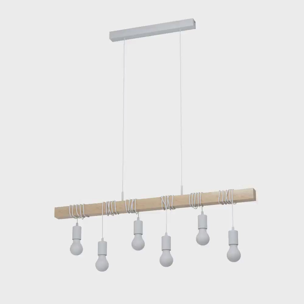 The TOWNSHEND pendant light features a wooden beam and six white lamp holders. The lamp holders are suspended at different heights and can be changed by winding or unwinding the cables. With its eye-catching mix of pinewood and metal, the pendant light blends seamlessly into modern interiors such as Scandi and vintage styles. The design provides distinctive lighting for any space, whether in the living room or over a long table in the dining room. The pictured milky-white lightbulbs are not included. The product has E27 lamp holders and requires E27 lightbulbs