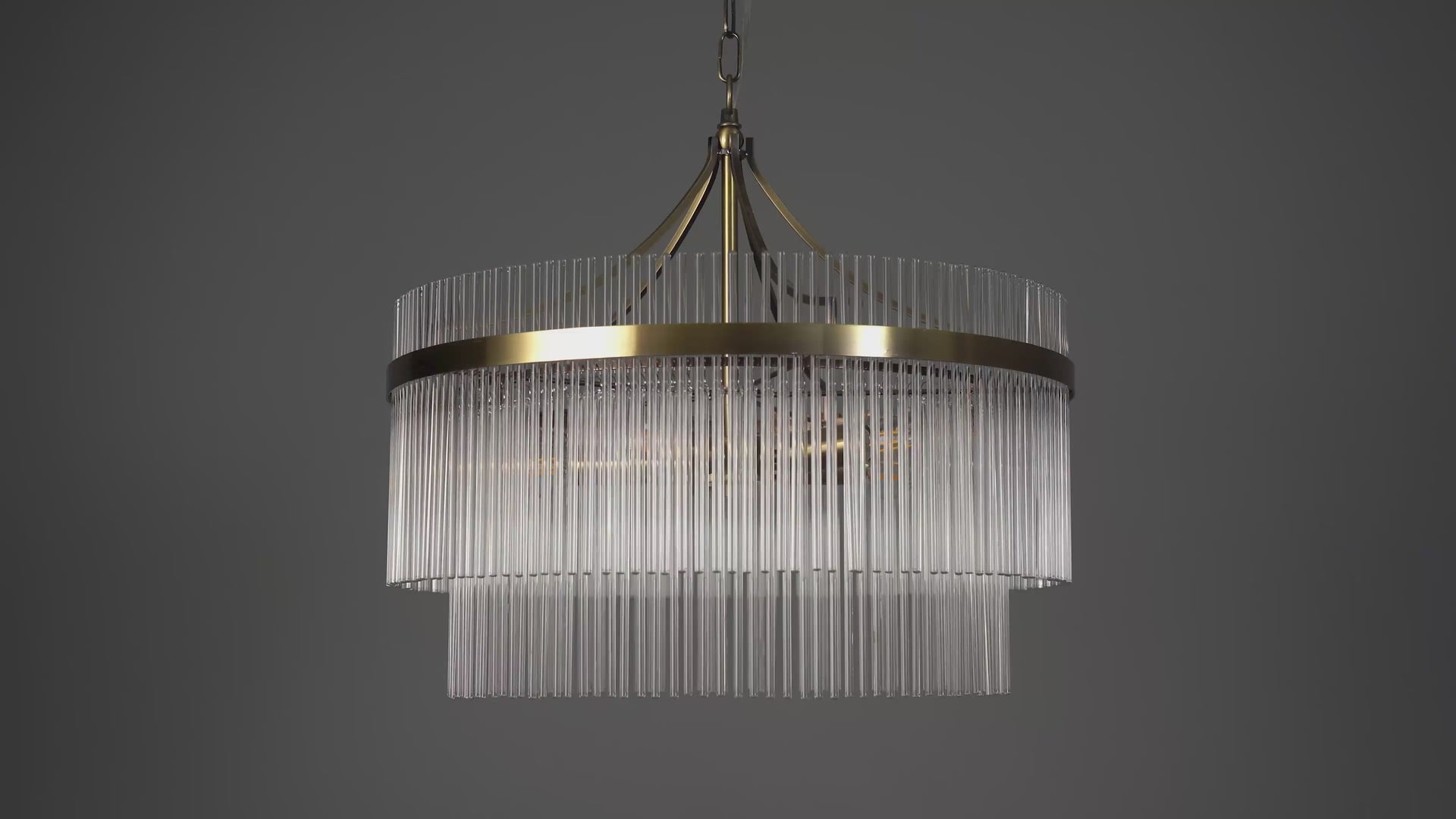 Beautiful contemporary interpretation of the chandelier in antique brass plated finish. Decorative clear glass rods diffuse the light to create an inviting ambience. The chain can be adjusted to suit ceiling height and allow it to be perfectly hung above dining tables or in living spaces. Matching items also available to create a cohesive look